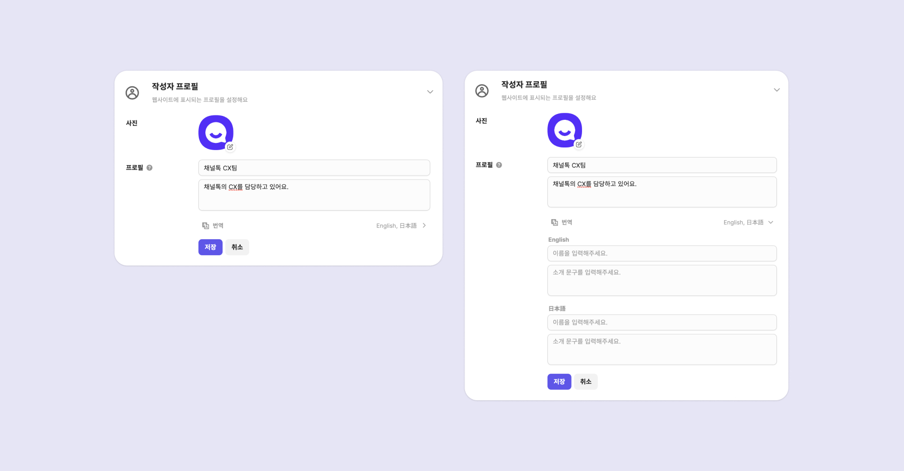 작성자 프로필은 스페이스별로 관리하며 매니저별로 하나씩 생성돼요. 해당 스페이스가 지원하는 언어에 따라 이름 및 소개 문구의 번역 값을 입력해 보세요.